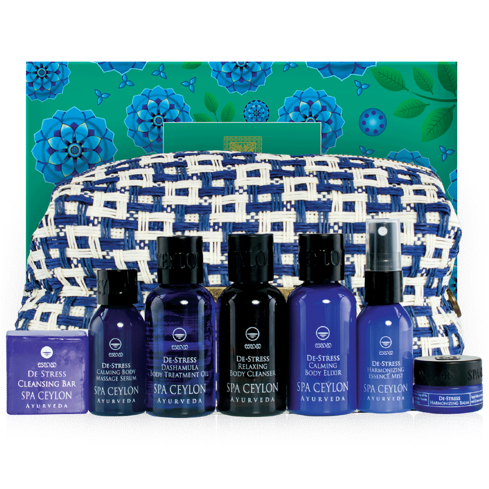 Entdecken Sie die entspannungsfördernde und stärkende Wirkung von DE-STRESS AYURVEDA Produkten mit dem edlen HOME SPA SET. Reicht für mindestens eine Woche des Ayurvedischen Antistress-Morgenrituals. Die kraftvollen ätherischen Essenzen von Weihrauch, Sandelholz, Kaffir Limette und Tangerine sind bewährte Mittel gegen Alltagsstress. Sie entspannen, kühlen die Sinne und balancieren Körper und Geist. So helfen sie, dem Alltagsstress zu widerstehen, stärken den Körper und verleihen im Spannkraft und Jugendlichkeit. Mit dem hochwertigen Kosmetiktäschchen – original ceylonesische Handarbeit – und edler Verpackung ein wunderbares Geschenk für alle, die täglich Stress ausgesetzt sind.